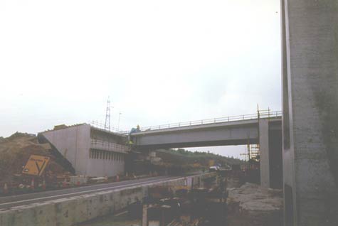 However, the cost of installing, maintaining and dismantling a temporary structure proved to be so high that it was cheaper to construct the deck of the new bridge on temporary supports to the north, divert traffic onto this deck while demolition and construction of the new supports took place and then slide this new deck into position during a closure of the motorway underneath. The slide took place on 31st May 1998.