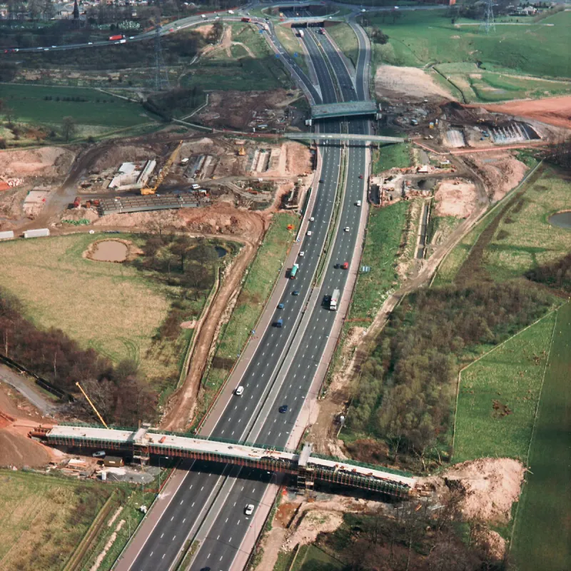 The project to build the M65 between junctions 1A (Bamber Bridge, south of Preston) and 3 (Riley Green, near Blackburn) ran from 1994 to 1997, and was documented with scores of aerial photographs, taken every three months while the works were happening. That's unusual enough; what's remarkable is that you can see the full archive of 466 photographs here, and search through them to see individual structures being built and construction processes taking place as the motorway evolves.