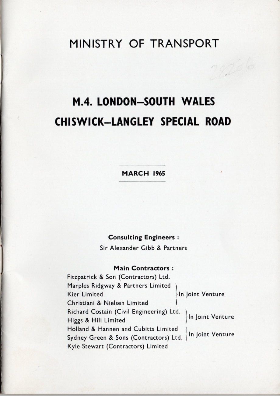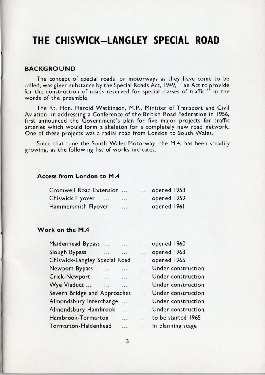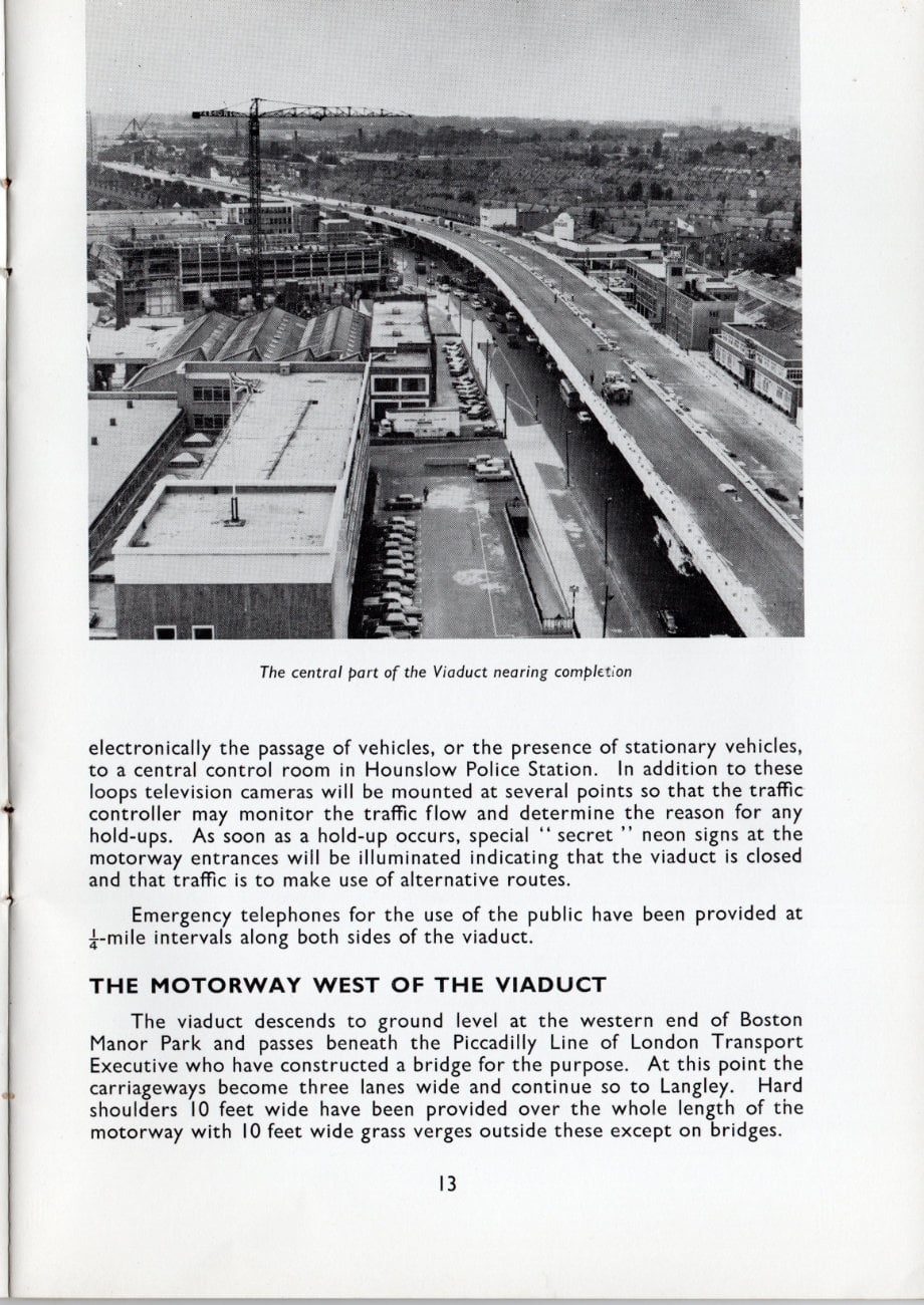 The excitement and pride surrounding this new and pioneering length of motorway is inescapable in this booklet published to mark its opening in 1964. It included the lengthy Brentford Viaduct, carrying the motorway above the Great West Road through the suburbs, a wholly new kind of road that had never been seen before in the UK.