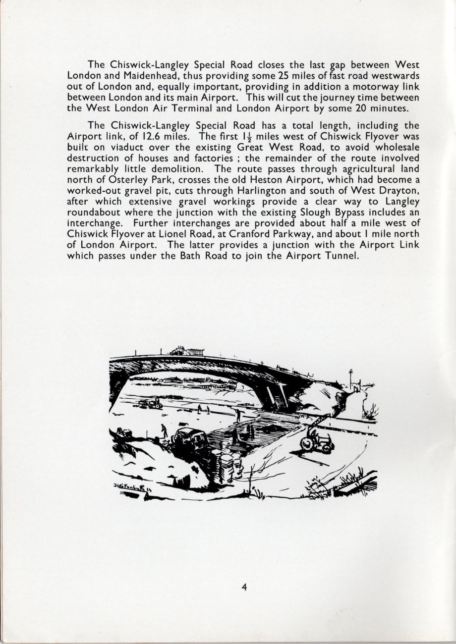 The Chiswick-Langley Special Road has a total length, including the Airport link, of 12.6 miles. The first 1½ miles west of Chiswick Flyover was built on viaduct over the existing Great West Road, to avoid wholesale destruction of houses and factories; the remainder of the route involved remarkably little demolition. The route passes through agricultural land north of Osterley Park, crosses the old Heston Airport, which had become a worked-out gravel pit, cuts through Harlington and south of West Drayton, after which extensive gravel workings provide a clear way to Langley roundabout where the junction with the existing Slough Bypass includes an interchange. Further interchanges are provided about half a mile west of Chiswick Flyover at Lionel Road, at Cranford Parkway, and about 1 mile north of London Airport. The latter provides a junction with the Airport Link which passes under the Bath Road to join the Airport Tunnel.