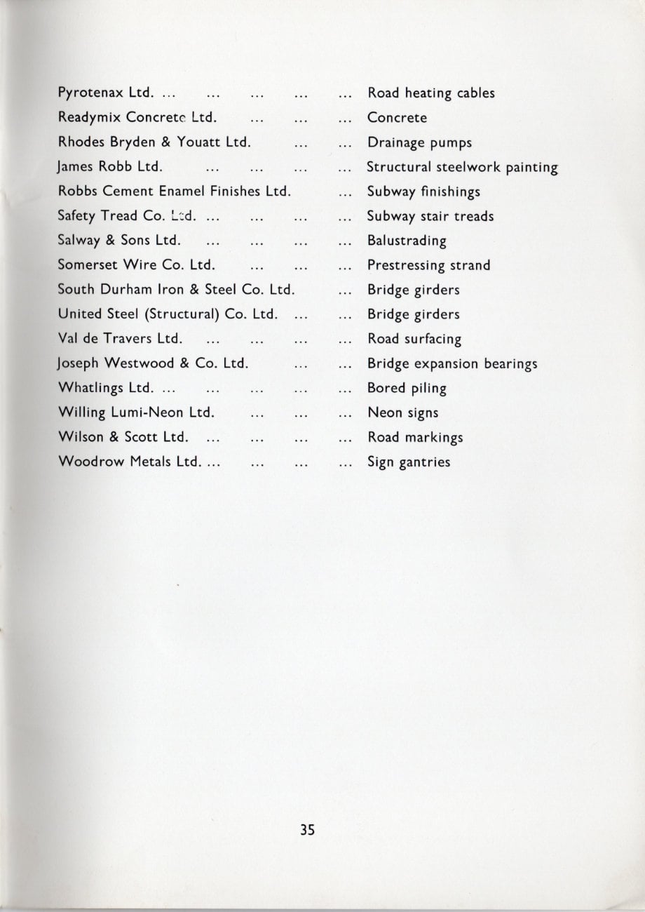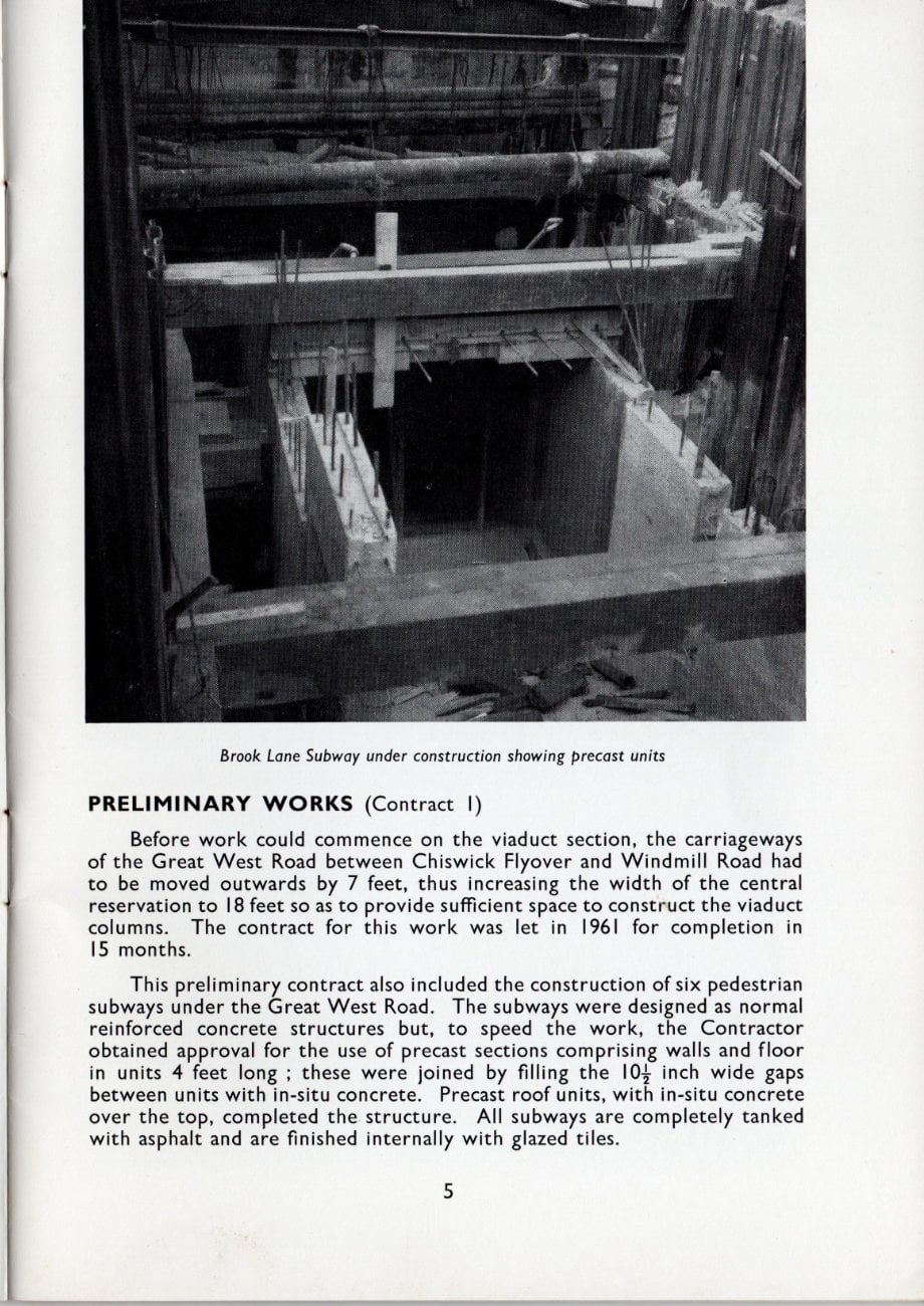 This preliminary contract also included the construction of six pedestrian subways under the Great West Road. The subways were designed as normal reinforced concrete structures but, to speed the work, the Contractor obtained approval for the use of precast sections comprising walls and floor in units 4 feet long; these were joined by filling the 10 inch wide gaps between units with in-situ concrete. Precast roof units, with in-situ concrete over the top, completed the structure. All subways are completely tanked with asphalt and are finished internally with glazed tiles.