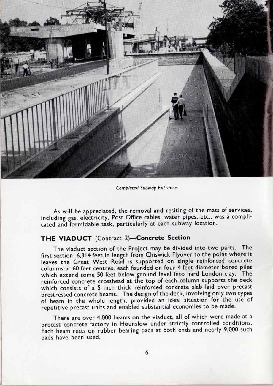 The viaduct section of the Project may be divided into two parts. The first section, 6,314 feet in length from Chiswick Flyover to the point where it leaves the Great West Road is supported on single reinforced concrete columns at 60 feet centres, each founded on four 4 feet diameter bored piles which extend some 50 feet below ground level into hard London clay. The reinforced concrete crosshead at the top of each column supports the deck which consists of a 5 inch thick reinforced concrete slab laid over precast prestressed concrete beams. The design of the deck, involving only two types of beam in the whole length, provided an ideal situation for the use of repetitive precast units and enabled substantial economies to be made.