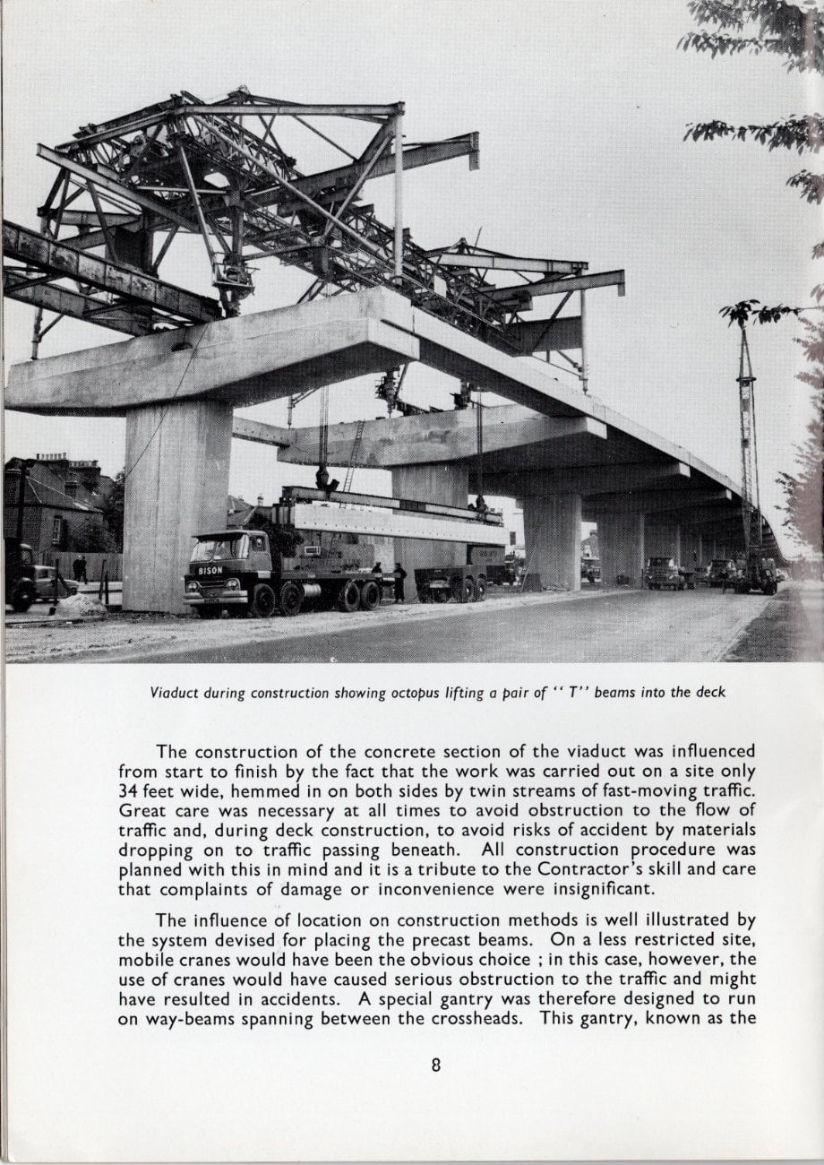 The influence of location on construction methods is well illustrated by the system devised for placing the precast beams. On a less restricted site, mobile cranes would have been the obvious choice; in this case, however, the use of cranes would have caused serious obstruction to the traffic and might have resulted in accidents. A special gantry was therefore designed to run on way-beams spanning between the crossheads. This gantry, known as the "Octopus", was able to straddle each gap in turn, supported by four legs on