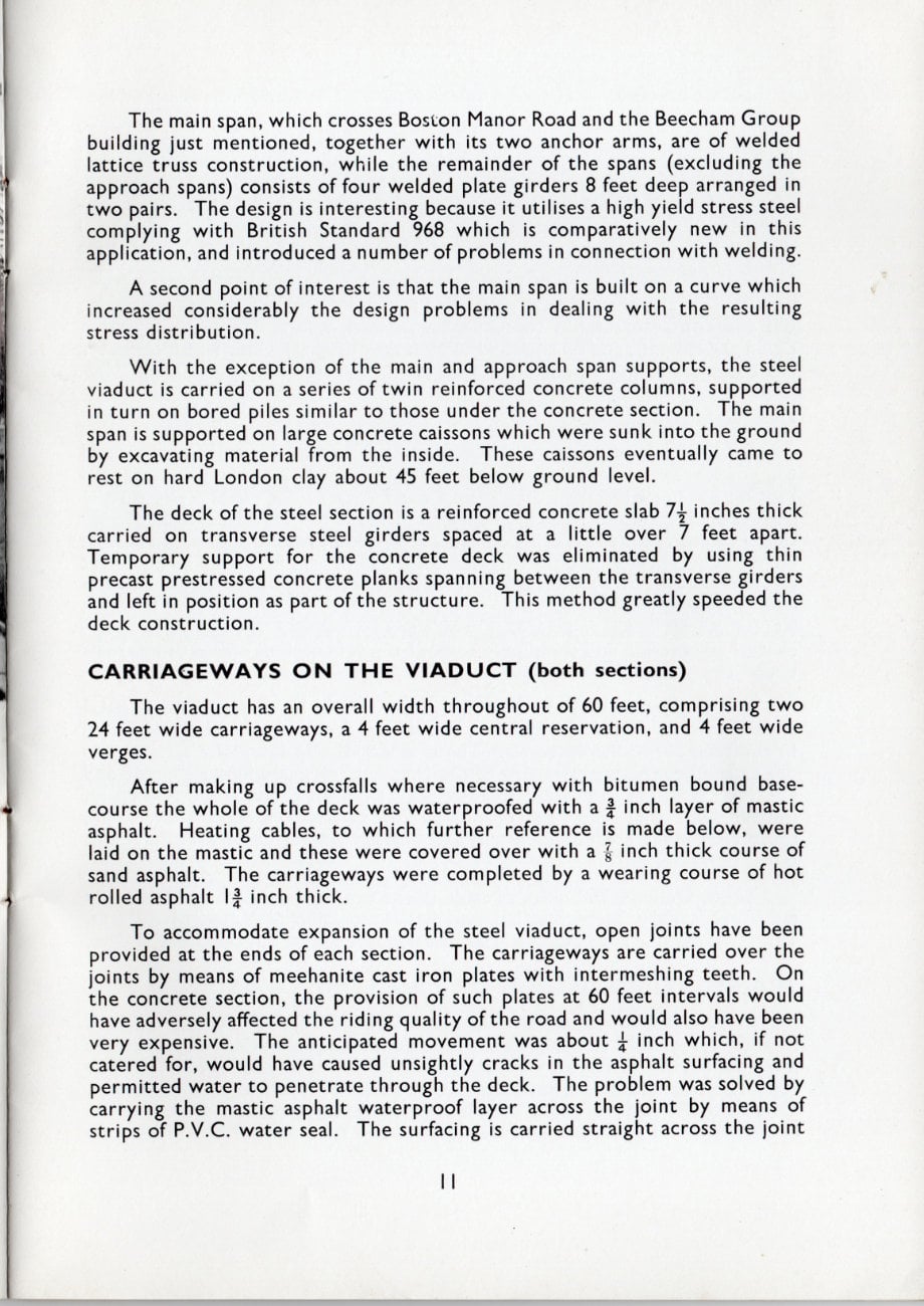 The main span, which crosses Boston Manor Road and the Beecham Group building just mentioned, together with its two anchor arms, are of welded lattice truss construction, while the remainder of the spans (excluding the approach spans) consists of four welded plate girders 8 feet deep arranged in two pairs. The design is interesting because it utilises a high yield stress steel complying with British Standard 968 which is comparatively new in this application, and introduced a number of problems in connection with welding.