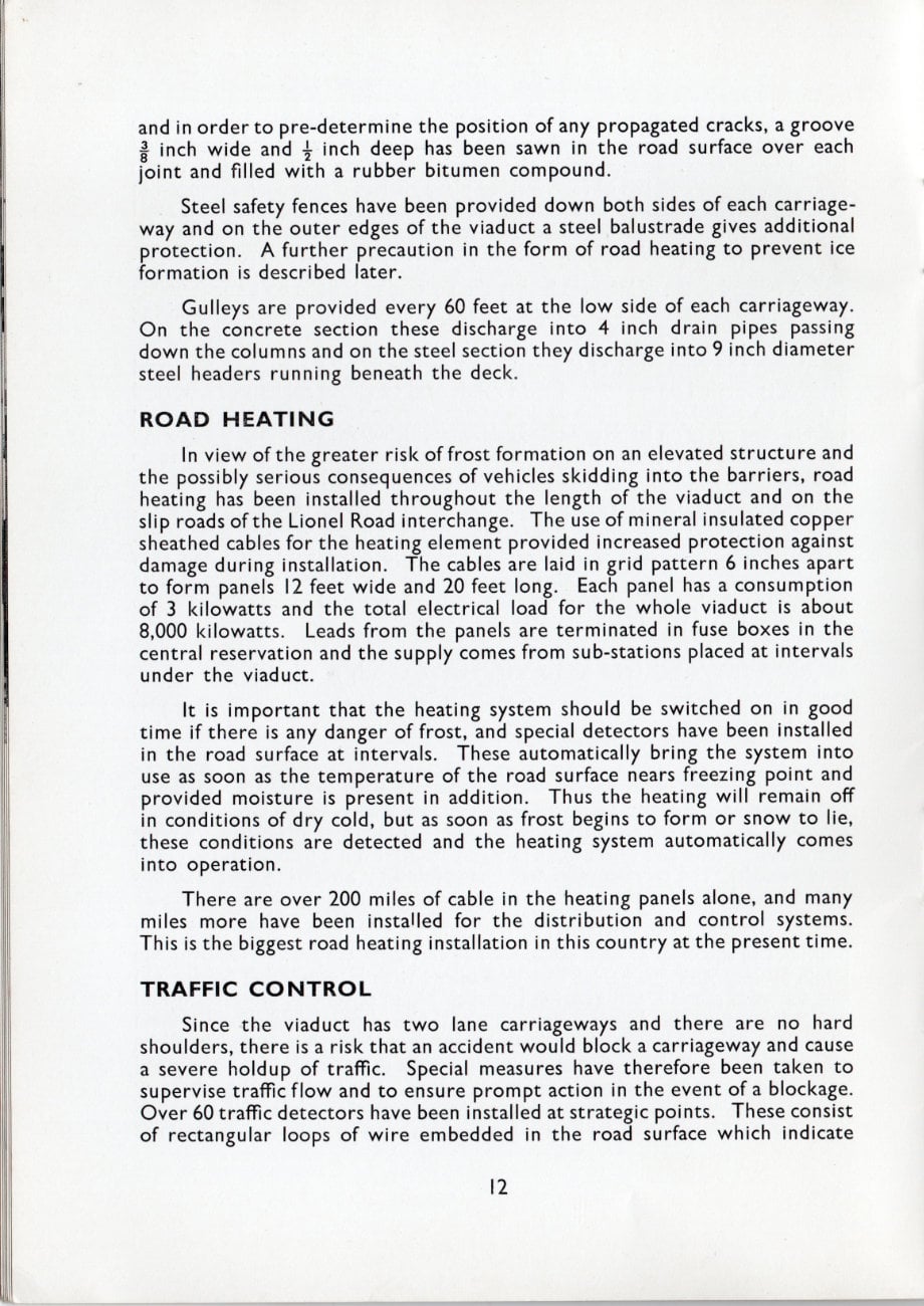 In view of the greater risk of frost formation on an elevated structure and the possibly serious consequences of vehicles skidding into the barriers, road heating has been installed throughout the length of the viaduct and on the slip roads of the Lionel Road interchange. The use of mineral insulated copper sheathed cables for the heating element provided increased protection against damage during installation. The cables are laid in grid pattern 6 inches apart to form panels 12 feet wide and 20 feet long. Each panel has a consumption of 3 kilowatts and the total electrical load for the whole viaduct is about 8,000 kilowatts. Leads from the panels are terminated in fuse boxes in the central reservation and the supply comes from sub-stations placed at intervals under the viaduct.