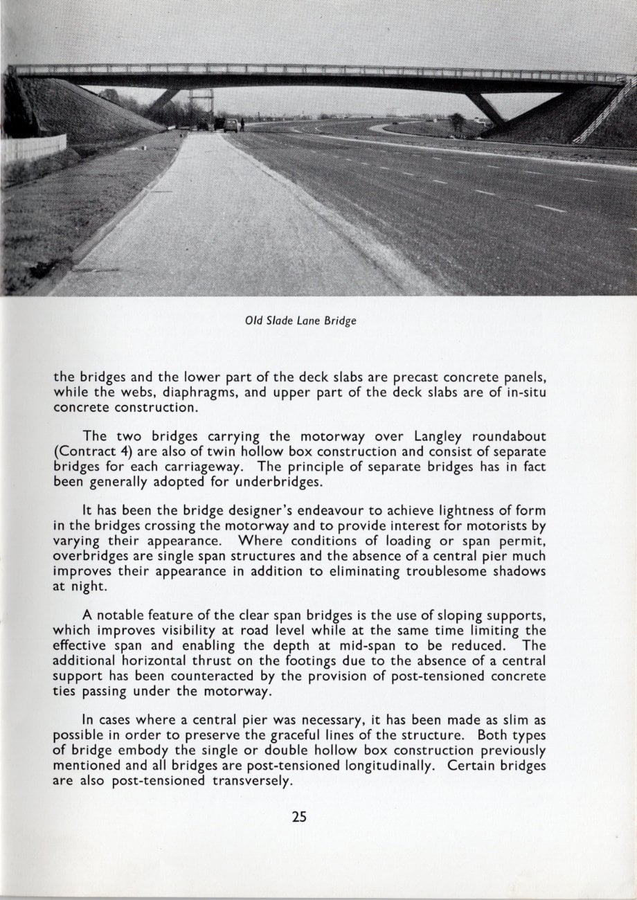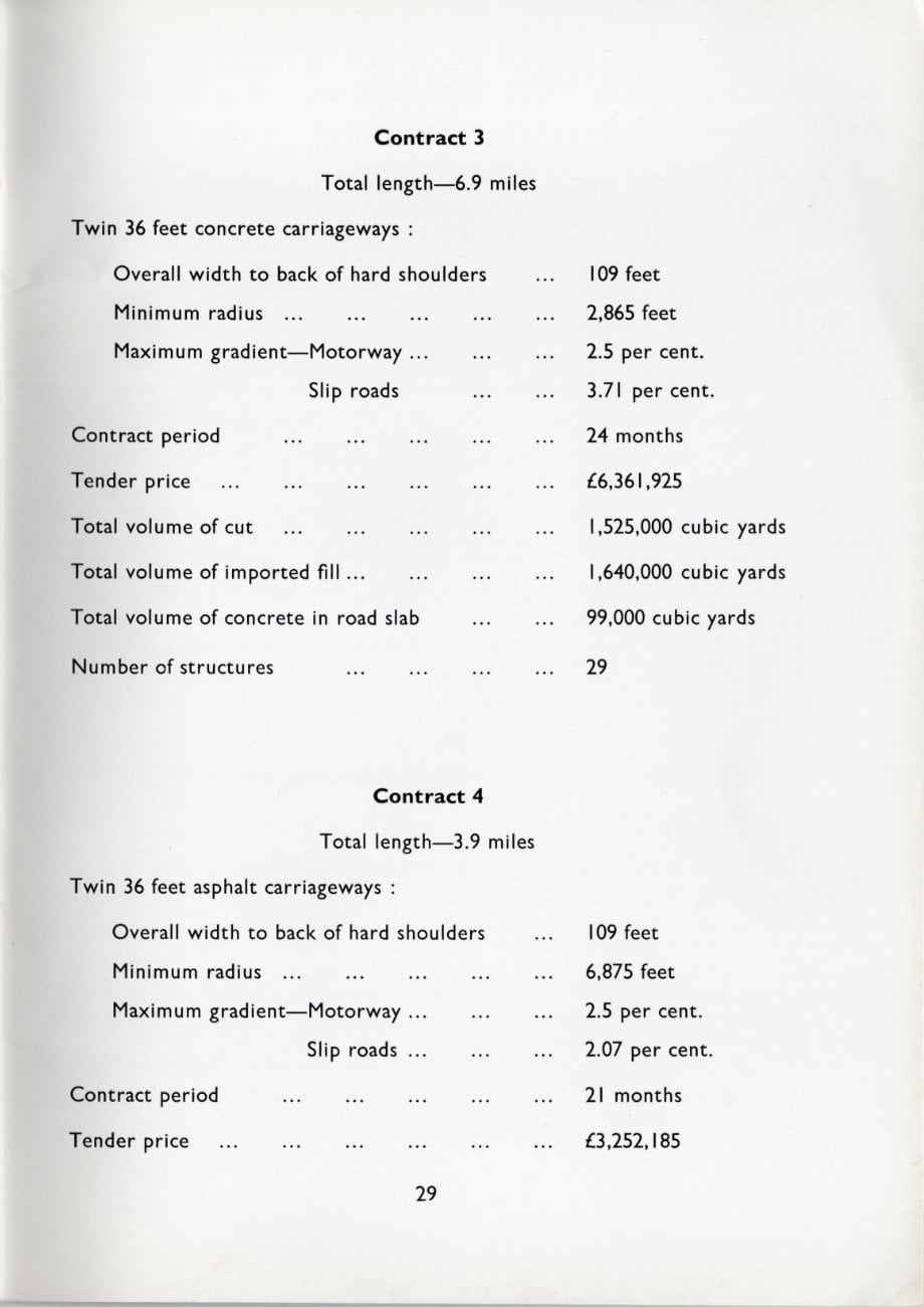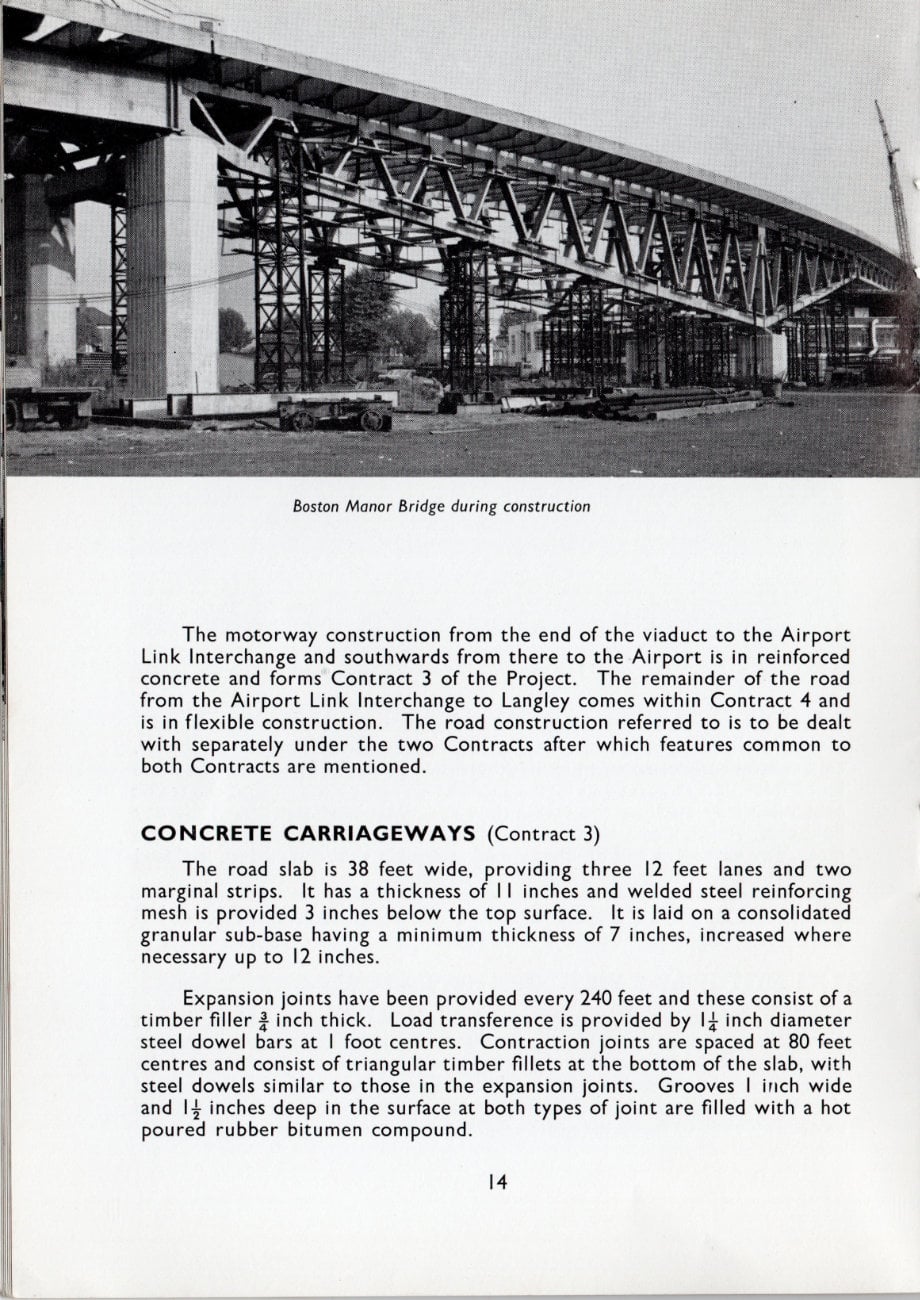The motorway construction from the end of the viaduct to the Airport Link Interchange and southwards from there to the Airport is in reinforced concrete and forms Contract 3 of the Project. The remainder of the road from the Airport Link Interchange to Langley comes within Contract 4 and is in flexible construction. The road construction referred to is to be dealt with separately under the two Contracts after which features common to both Contracts are mentioned.