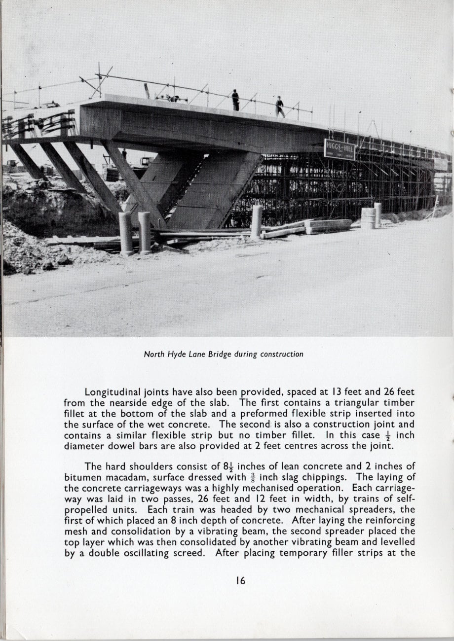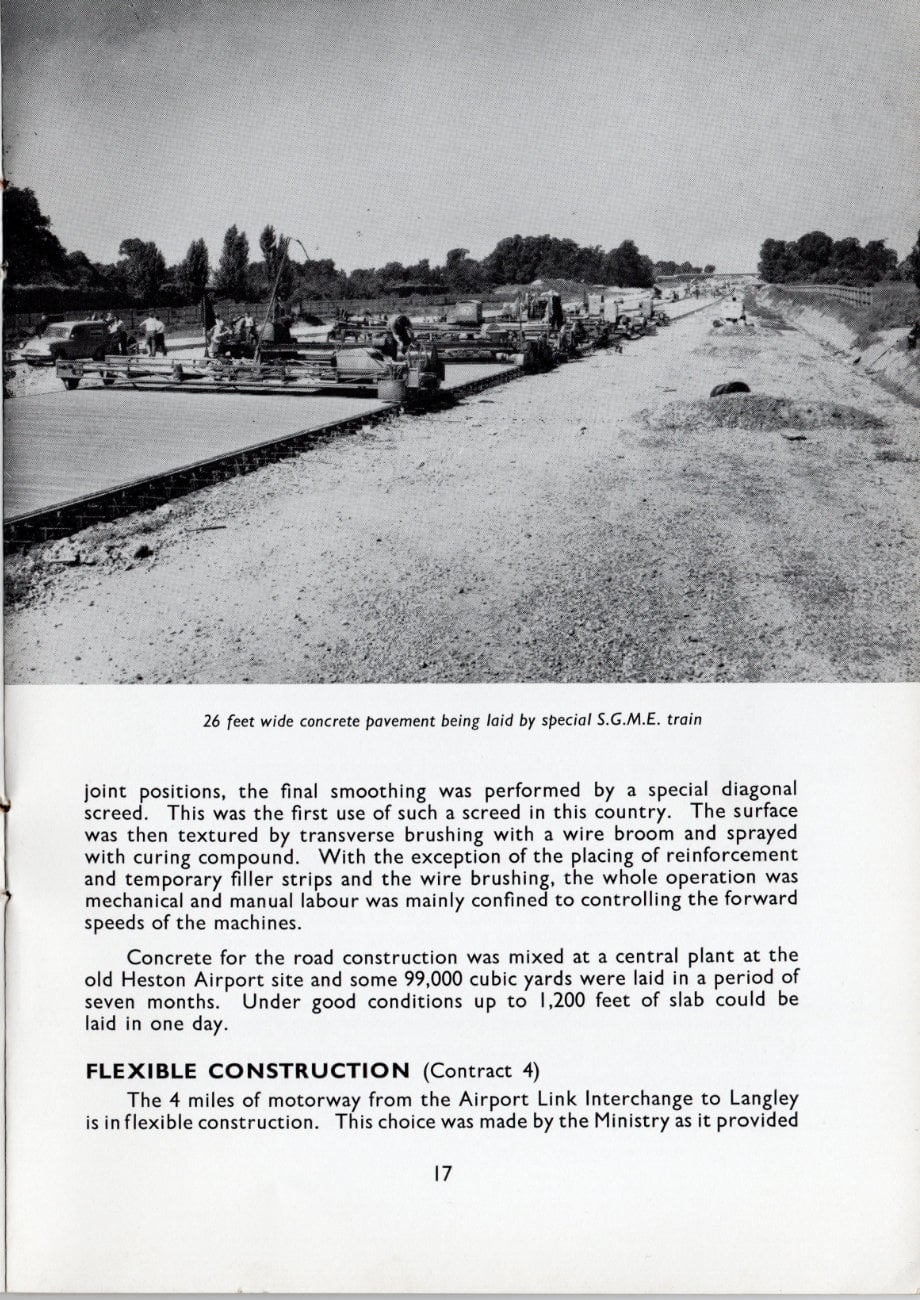 Concrete for the road construction was mixed at a central plant at the old Heston Airport site and some 99,000 cubic yards were laid in a period of seven months. Under good conditions up to 1,200 feet of slab could be laid in one day.
