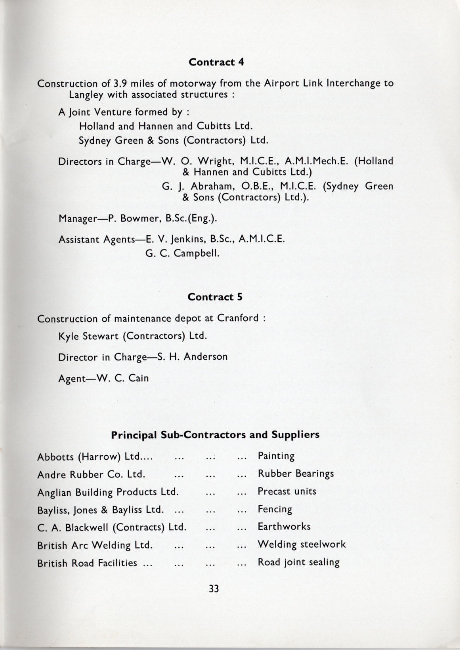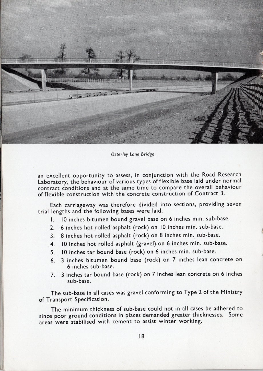 The 4 miles of motorway from the Airport Link Interchange to Langley is in flexible construction. This choice was made by the Ministry as it provided an excellent opportunity to assess, in conjunction with the Road Research Laboratory, the behaviour of various types of flexible base laid under normal contract conditions and at the same time to compare the overall behaviour of flexible construction with the concrete construction of Contract 3.