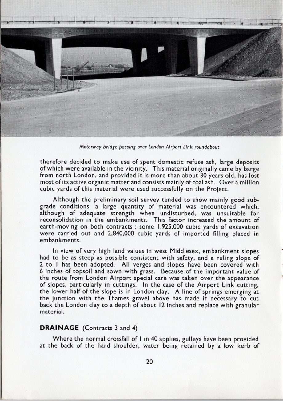 Under the conditions imposed by the semi-urban nature of the route, it was inevitable that a great deal of filling material would be required for embankments over and above that which could be obtained from cuttings. This is difficult to obtain at reasonable cost in West London and it was therefore decided to make use of spent domestic refuse ash, large deposits of which were available in the vicinity. This material originally came by barge from north London, and provided it is more than about 30 years old, has lost most of its active organic matter and consists mainly of coal ash. Over a million cubic yards of this material were used successfully on the Project.