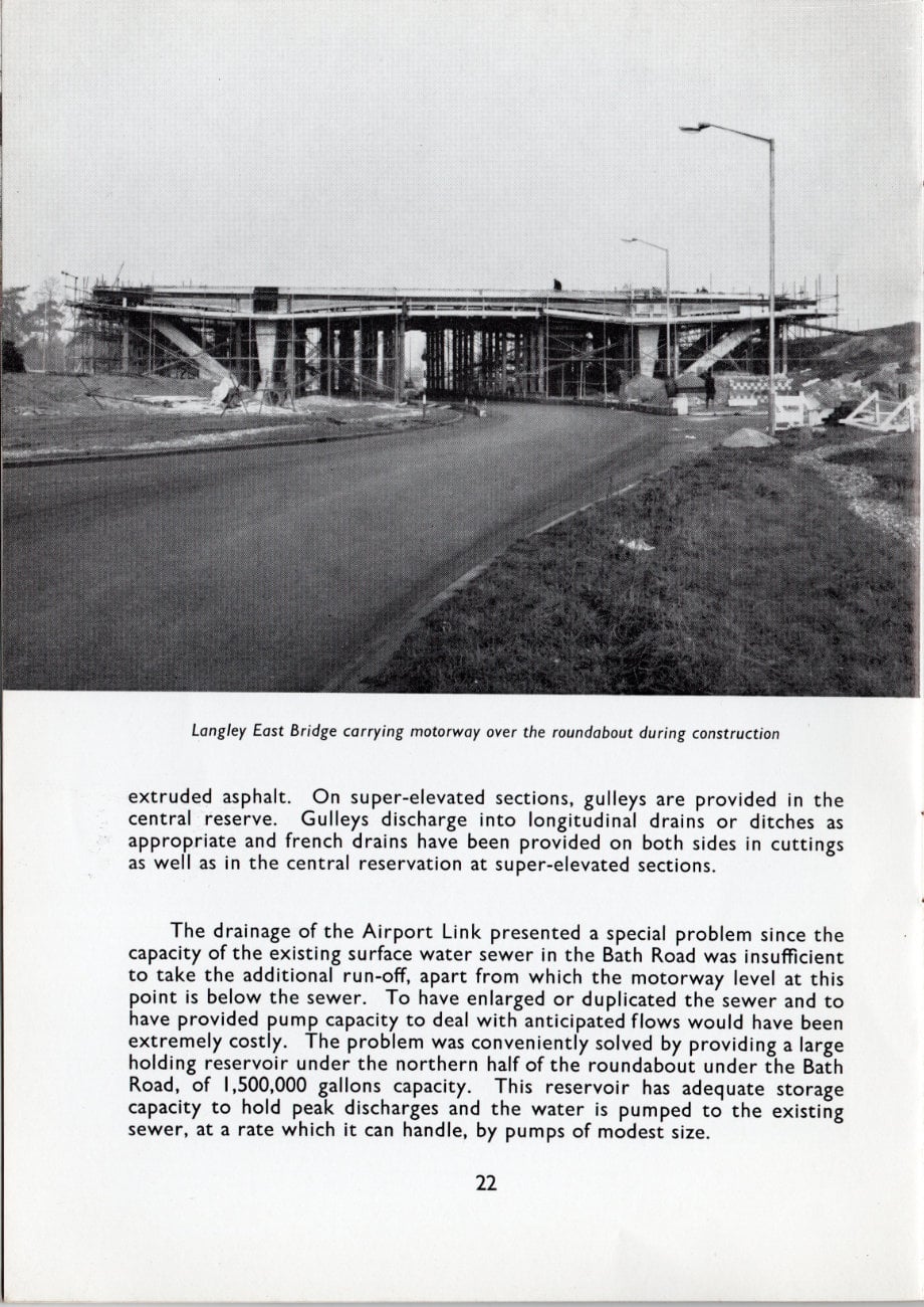 The drainage of the Airport Link presented a special problem since the capacity of the existing surface water sewer in the Bath Road was insufficient to take the additional run-off, apart from which the motorway level at this point is below the sewer. To have enlarged or duplicated the sewer and to have provided pump capacity to deal with anticipated flows would have been extremely costly. The problem was conveniently solved by providing a large holding reservoir under the northern half of the roundabout under the Bath Road, of 1,500,000 gallons capacity. This reservoir has adequate storage capacity to hold peak discharges and the water is pumped to the existing sewer, at a rate which it can handle, by pumps of modest size.