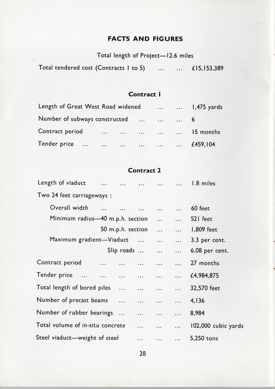 Before work could commence on the viaduct section, the carriageways of the Great West Road between Chiswick Flyover and Windmill Road had to be moved outwards by 7 feet, thus increasing the width of the central reservation to 18 feet so as to provide sufficient space to construct the viaduct columns. The contract for this work was let in 1961 for completion in 15 months.